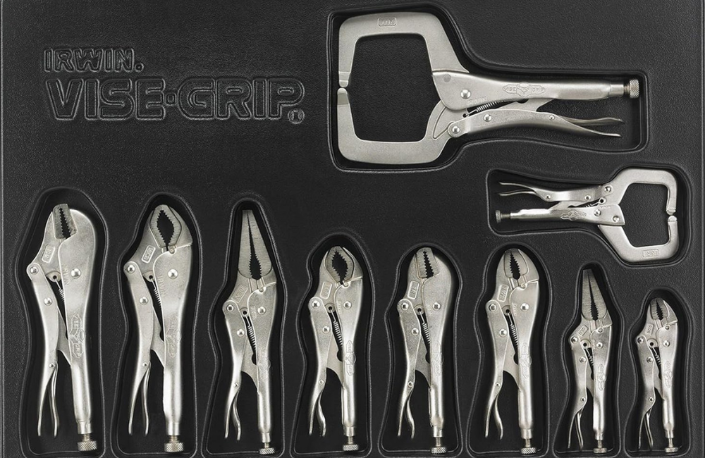 - Set includes 6" and 11" Original Locking Clamps, 10" and 7" straight jaws, 10" and 7" curved jaws, 7" and 5" curved jaws with a wire cutter, 6" and 9" long noses with a wire cutter, Original Locking Pliers, and a tray