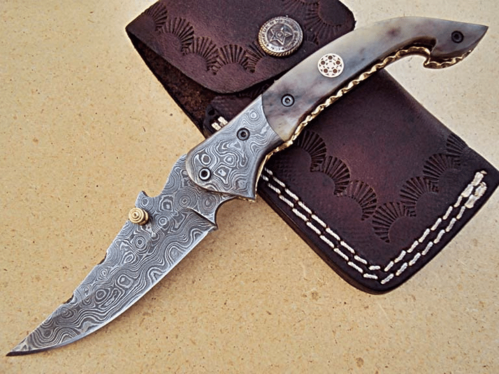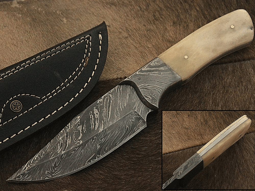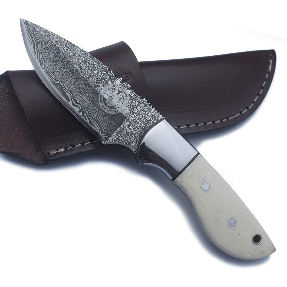 - This Damascus hunting knife is forged in fire using Damascus steel with Brass Liners & Pins & Bone/Pakka Wood Handle, which makes these Damascus knives, pocket knives & skinning knives extremely comfortable & easy to hold with a leather knife sheath and belt loop. This bone handle knife is a perfect gift and goes well with fishing gear and equipment.