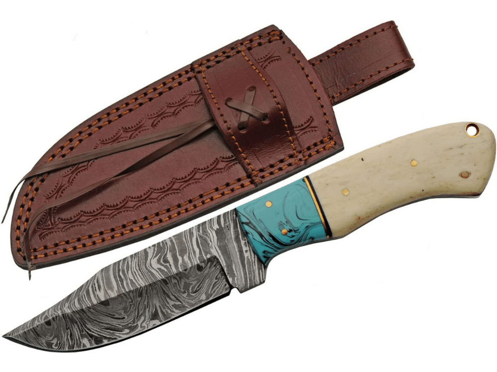 - Stand-Out: This results in a true outdoor knife with a standout turquoise color for accent to the all-white bone handle material and water-like patterns of the Damascus blade and comes with a top-grain authentic leather sheath for easy carry and quick storage