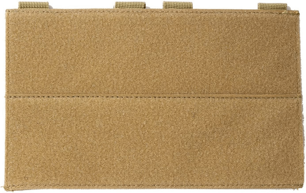 The panel backing consists of bar-tacked hook-and-loop strips that feed through molle loops and then affix to the back of the panel.