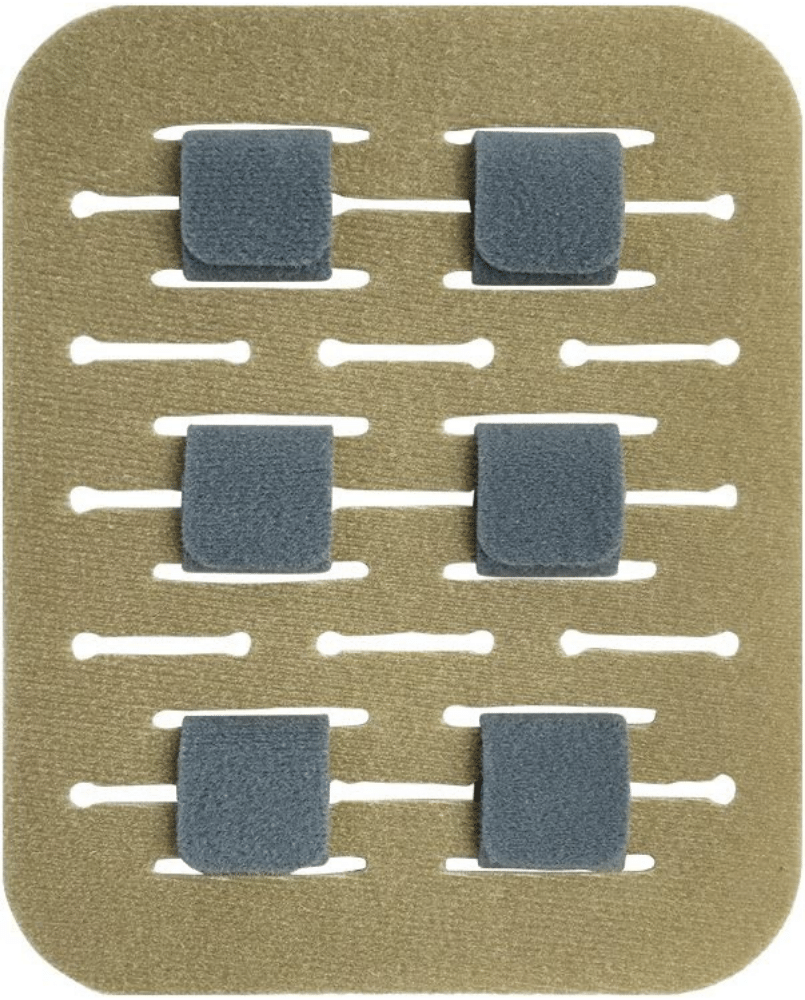 The entire system is only 0.7 ounces (20 grams) that includes 1 main panel (5.5" (W) x 7" (H)) and 6 Hook & Loop anchors (1" (W) x 3" (L) each) for you to convert any MOLLE/PALS pouches into Hook & Loop attachments. Unlike other Hook-and-Loop panels, the MOHL-AIR Adapter uses a unique offset arrangement to perfectly align both space-centered and stitch-centered MOLLE/PALS accessories.