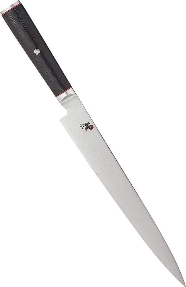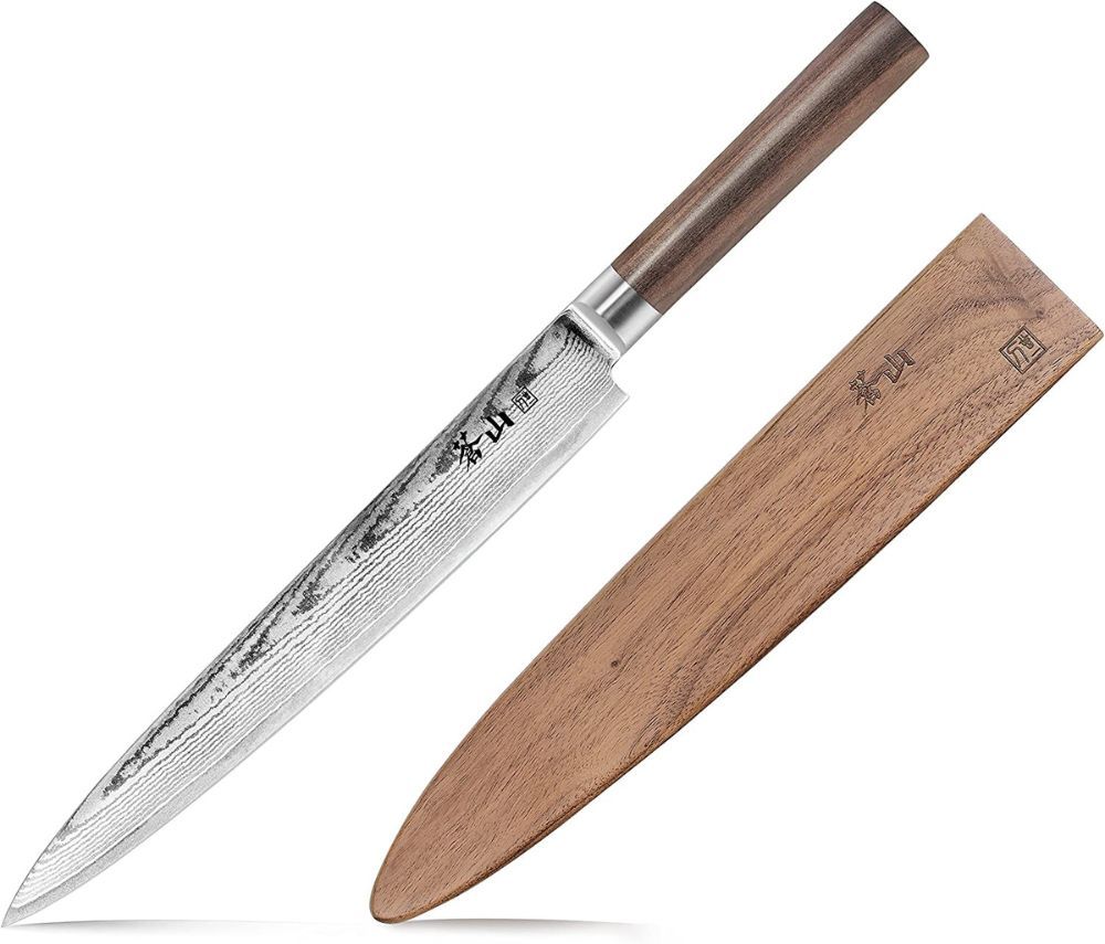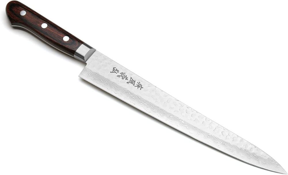 - Handcrafted Japanese slicing knife with a VG10 steel cutting core for excellent edge retention; Rockwell Hardness 61