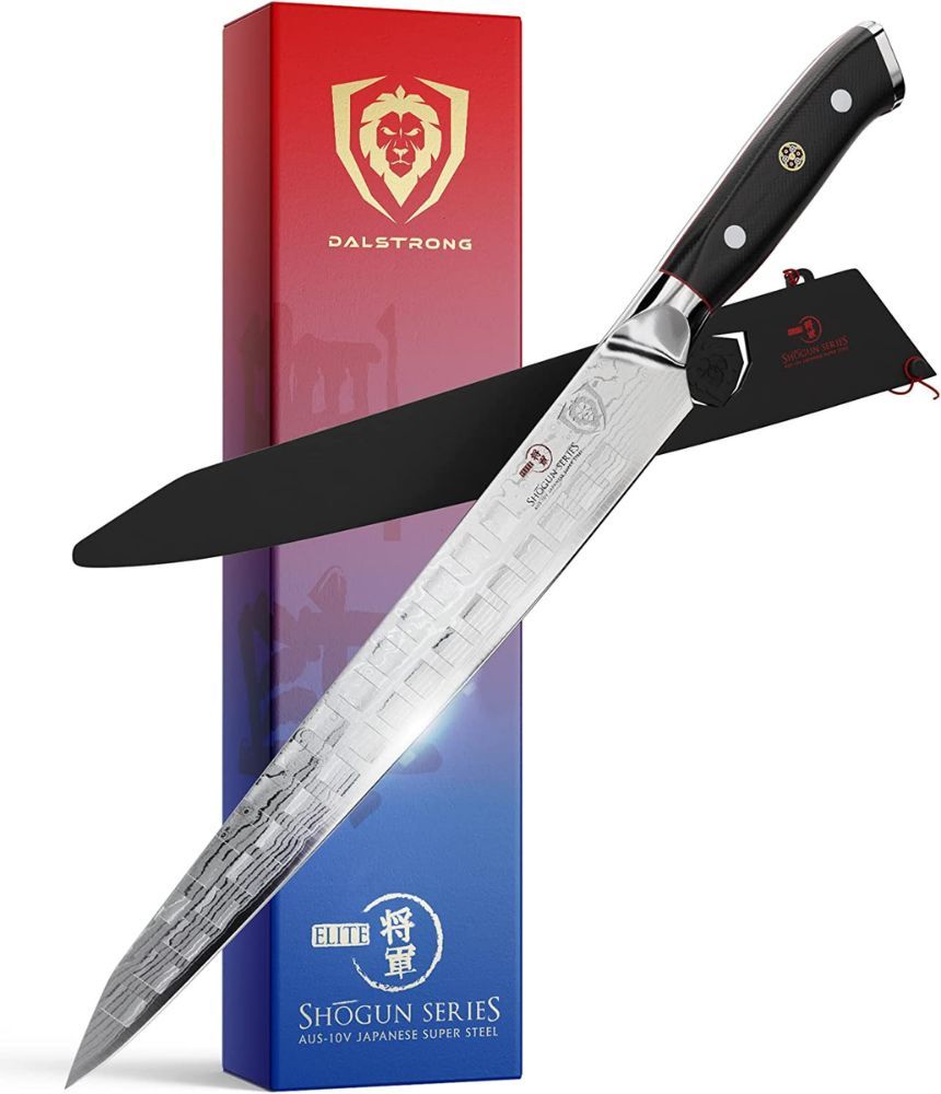 - Dalstrong Power: Ultra sharp AUS-10V Vacuum Treated Japanese super steel cutting core at 62+ Rockwell hardness for extraordinary performance and edge retention. 67 layers of premium high-carbon stainless steel for exceptional strength, durability, and stain resistance. This uniquely designed slicer features a slightly curved belly, and a more narrow tip, affording unexpected maneuverability for the length.