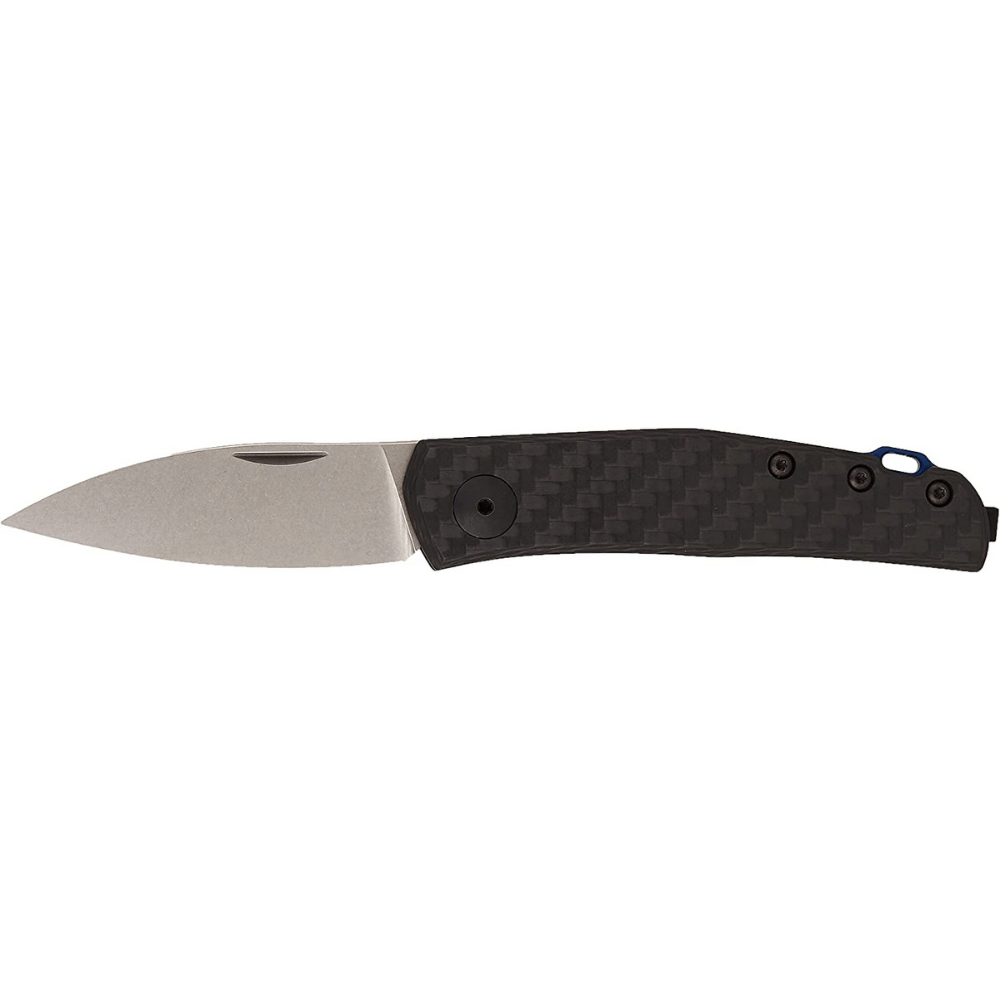 The button release on the high-strength Compression Lock mechanism allows the knife to be closed safely and easily. The Smock also has a skeletonized handle with full stainless steel liners, textured carbon fiber/G-10 laminate scales, and lightweight open-backed construction.