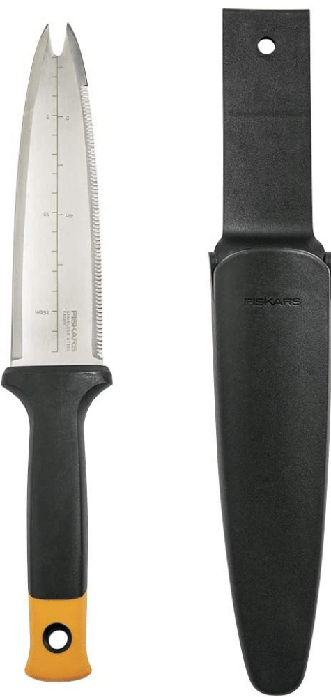 A multi-purpose garden knife designed to weed, plant, split, transplant, and more, the Fiskars Hori Hori Garden Tool has a corrosion-resistant, stainless steel blade with an extended tang for added durability. This dual-edged knife features a sharp, precision-ground edge for cutting through sod and root systems and a serrated edge for sawing through the thick growth. A forked tip makes easy work of weeding, while easy-to-read English and metric measurements ensure precise planting depth. An ergonomic, Softgrip handle offers comfort and control, while an included hard plastic sheath with a belt loop provides convenient storage and portability.