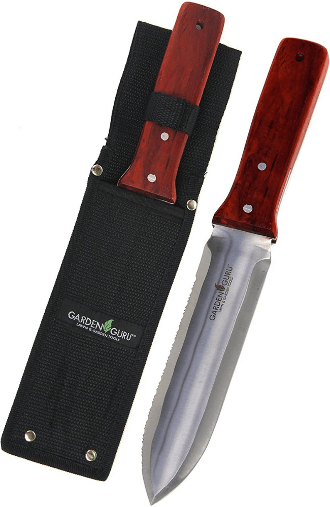 This Hori Hori knife has a sturdy wooden handle made from hardwood and comes with an extra thick, highly durable leather sheath. The Attican gardening knife won’t disappoint any gardener.