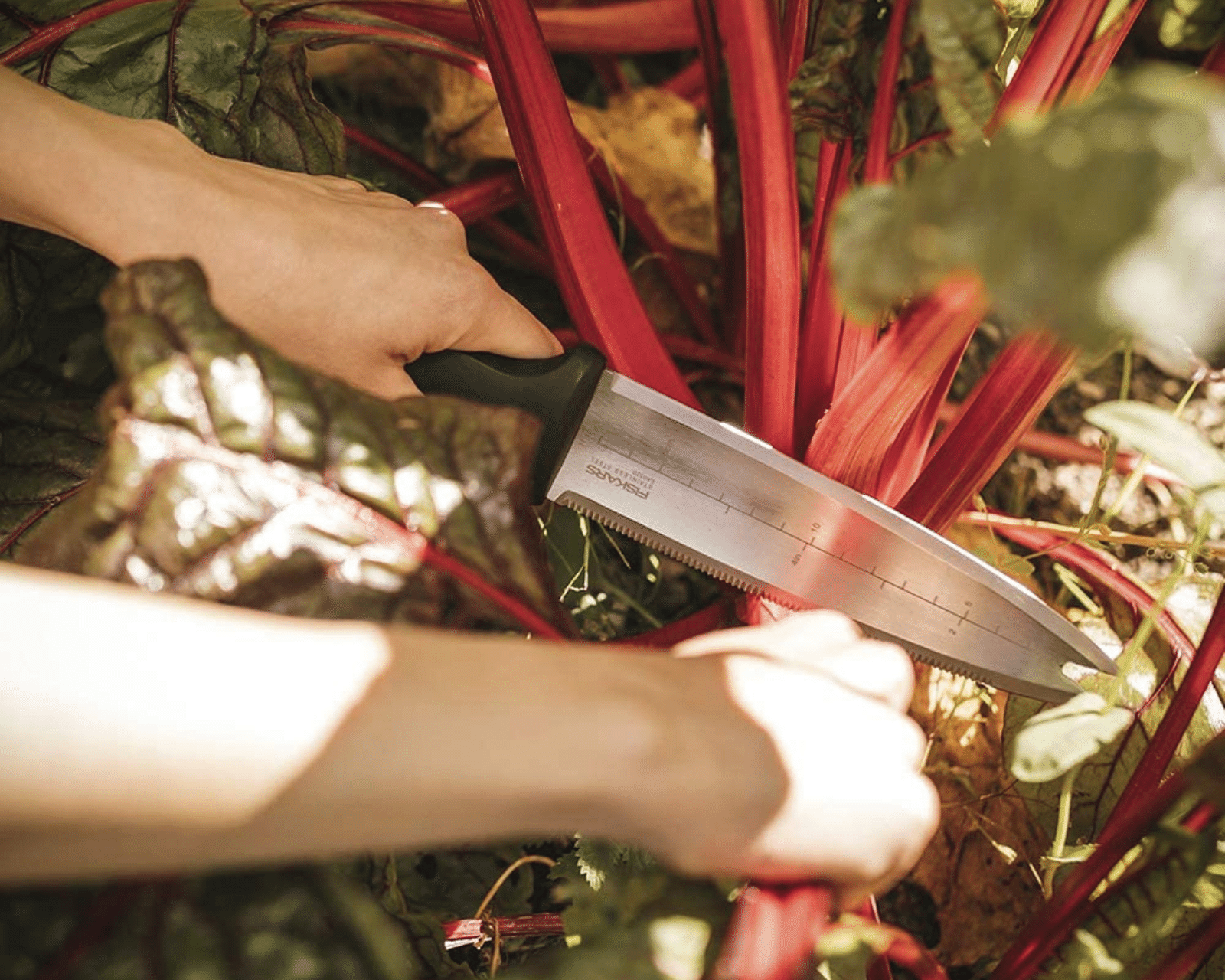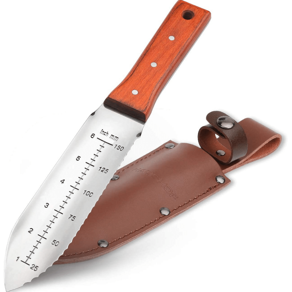 It features a concave blade for digging, a beveled sharp edge for slicing, and a serrated opposite edge for cutting. Inch markers engraved on the blade ensure you can plant at precisely the correct depth, measure rope, and more. These knives aren’t only for gardeners! It is also a great knife for landscaping and camping.
