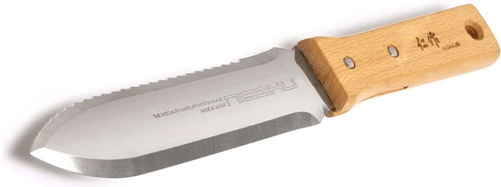 The Nisaku stainless steel weeding knife boasts both straight & serrated edges that are useful for dividing plants, planting bulbs, flowers & herbs, digging out weeds, removing rocks, cutting through roots & so much more! It is the most popular garden knife.