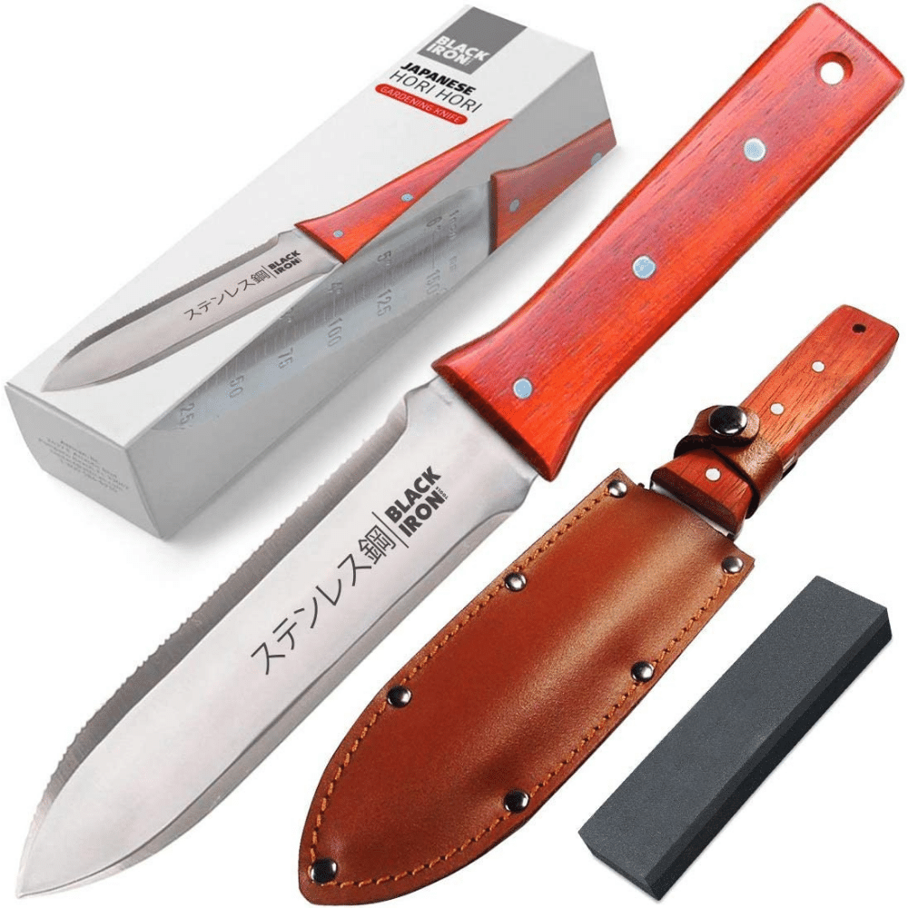 - PREMIUM QUALITY & DESIGN. Take your gardening skills to the next level with Black Iron's Hori-Hori Garden Knife. It features a beveled edge for slicing and a serrated edge for cutting through tough roots and a sturdy ergonomic handle for better grip and ease of use.