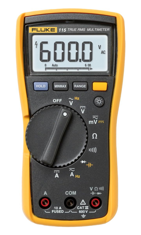 Fluke 115 Digital Multimeter, Measures AC/DC Voltage To 600 V & Current to 10 A, Measures Resistance, Continuity, Frequency & Capacitance, Includes Battery, Holster & 4mm PVC-Insulated Test Lead