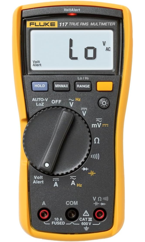The Fluke 117 Electrician's Multimeter is the ideal tool for electricians seeking reliability and precision. Featuring integrated non-contact voltage detection and the AutoV/LoZ function, it prevents false readings from ghost voltage. Users worldwide praise the Fluke 117 as a smart investment in accuracy. This digital multimeter offers Min/Max/Average readings and can measure frequency and capacitance. Its user-friendly design saves you time, enabling smooth transitions from job to job. With surge protection of 6 kV peak per IEC 61010-1 600 V CAT III, Pollution Degree 2, the Fluke 117 Multimeter is engineered for safety and performance.