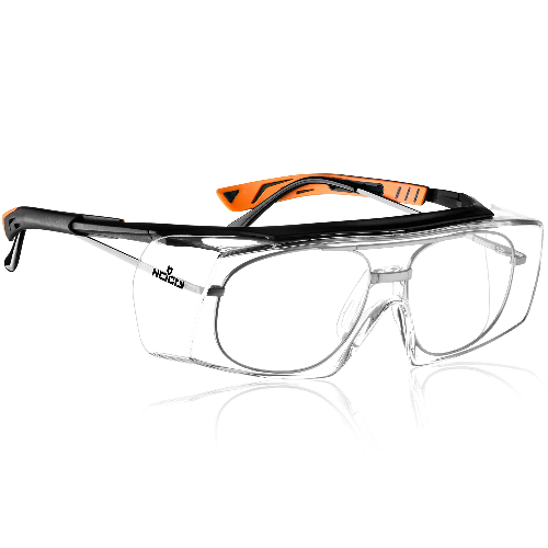 NoCry Safety Glasses That Fit Over Your Prescription Eyewear. Clear Anti-Scratch Wraparound Lenses, UV400 Protection, ANSI Z87 & OSHA Certified. Use in the Lab, Travelling Black & Orange Clear