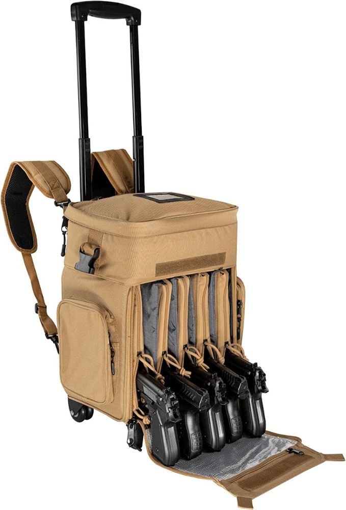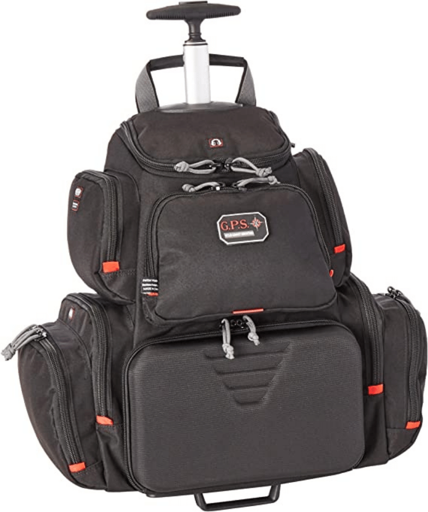 It features a telescoping handle so it can be easily wheeled around and boasts plenty of storage pockets designed specifically for storing eye and ear protection, targets, stapler, tape, binos, tools, cleaning supplies, extra magazines, and more.