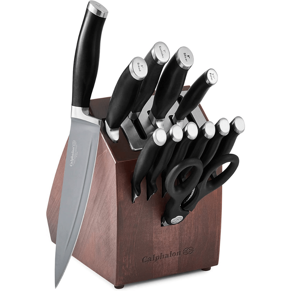 Calphalon kitchen knife sets are perfect for any home cook. These self-sharpening stainless steel blades have a full tang design which provides balance so you can easily perform most tasks without worrying about your hand cramping up from holding onto this heavy equipment all day long while slicing vegetables into impeccable shapes or creating delicious dishes that will surprise even the most demanding palate.