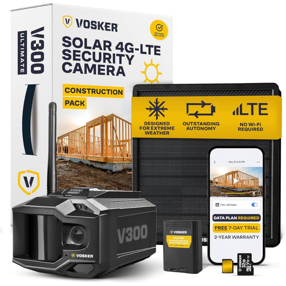 Vosker V300 Ultimate Construction Pack Outdoor Security Camera with External Solar Panel for Remote Construction Sites 4G LTE Black Single Unit with Battery