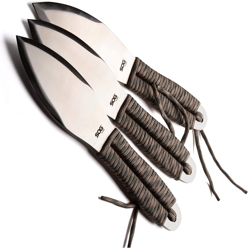 The SOG F041TN-CP Throwing Knives look a lot like pared-down, skeletonized versions of bowie knives. They're made from solid black finished 420 steel and feature an extra grip it has a cord wrapped for your hands in case you need it as well and makes them easier to carry.