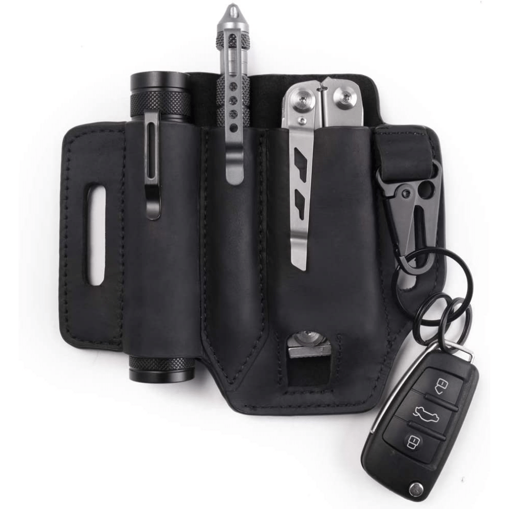 The EDC Belt Sheath is a 3-in-1 EDC leather holder for most sides of multitools. It has an exterior made from high-quality genuine cowhide that fits belts up to 1 5/8 inches wide, so you can carry your favorite tool with ease!
