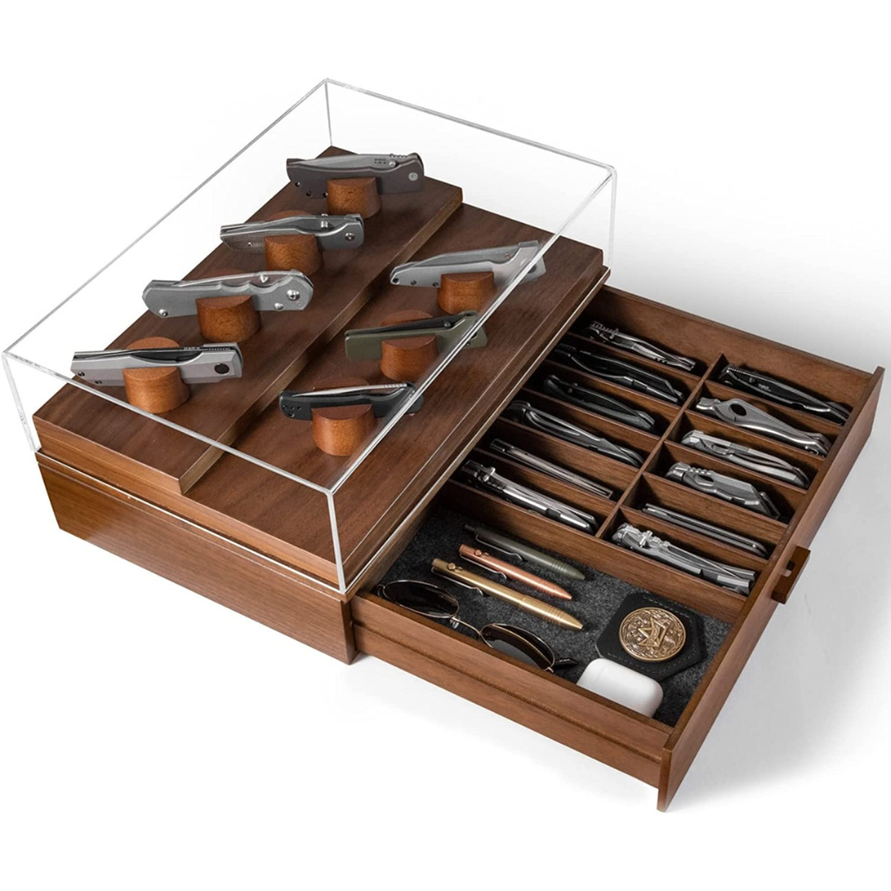 - Protect and Preserve — With this knife display case for folding knives, your pocket knives are shielded from dust and scratches beneath the clear acrylic cover and felt-lined drawer. This wooden knife showcase display with a 360° view was tested among dedicated knife collectors to ensure it would meet your protection needs.