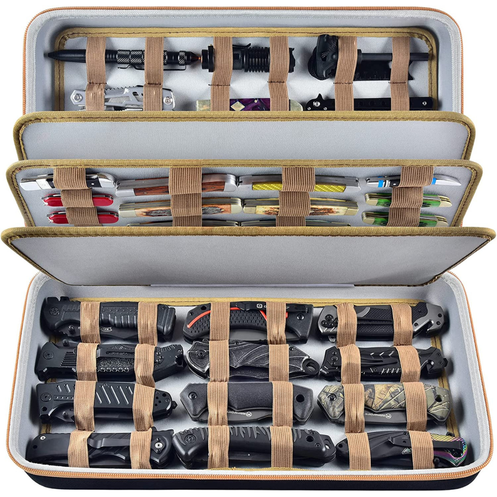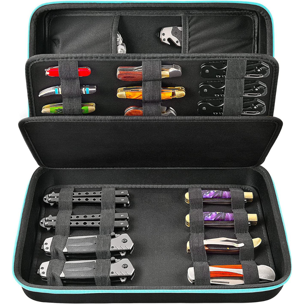 - Perfect Protection for EDC Pocket Knife Storage Bag: This collectible knife holder box is made of premium hard EVA material, which is good water resistance and shockproof to protect your pocket knives for men from scratching, rusting, and damaging, case knife with generous stretch elastic bands keep your folding knives in place will not fall out easily, with 2 middle buffer flap prevent butterfly knives from scuffing and scratching each other. Reinforced center flap page, not easy to fall off.