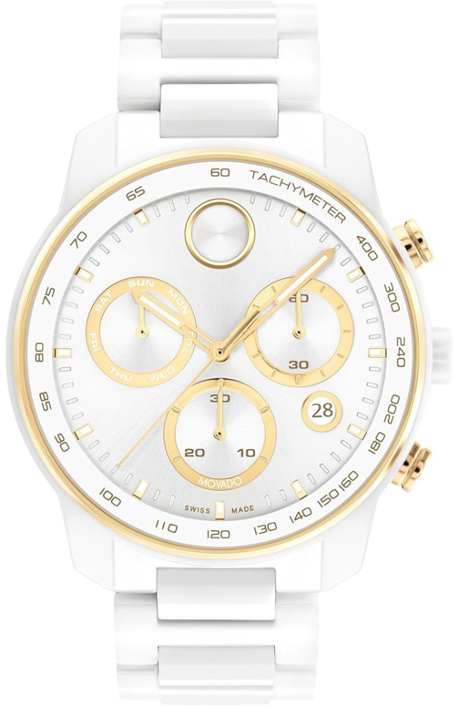 - This statement-making 44mm case is paired with an ultra-contemporary ceramic bracelet, all in monochromatic white with yellow goldtone ion-plated accents. The tonal chronograph dial features our iconic dot motif at 12:00, a date window, three subdials, and Swiss Super-LumiNova accents framed by a tachymeter bezel.