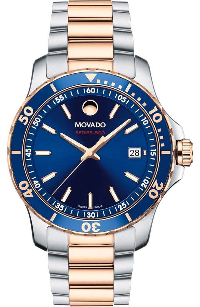 - Men's Series 800, stainless steel and rose gold PVD case and link bracelet, blue dial with index.