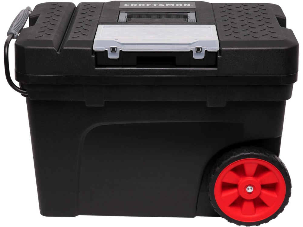 - Many Craftsman rolling systems use a telescoping handle and large 7 in wheels so users can pull the box like luggage across rough terrain or shop floors.