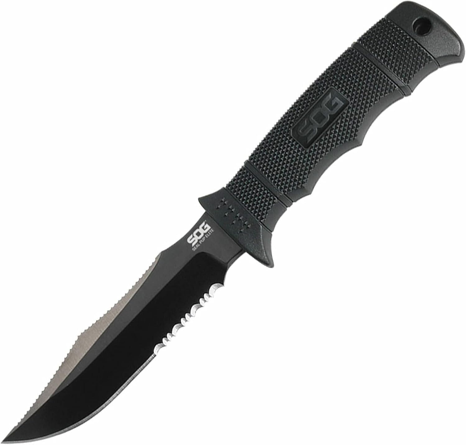 - BLACK TITANIUM NITRIDE-COATED PARTIALLY SERRATED BLADE: SOG’s cryogenic heat treatment hardens steel at the atomic level for a far stronger fixed blade knife