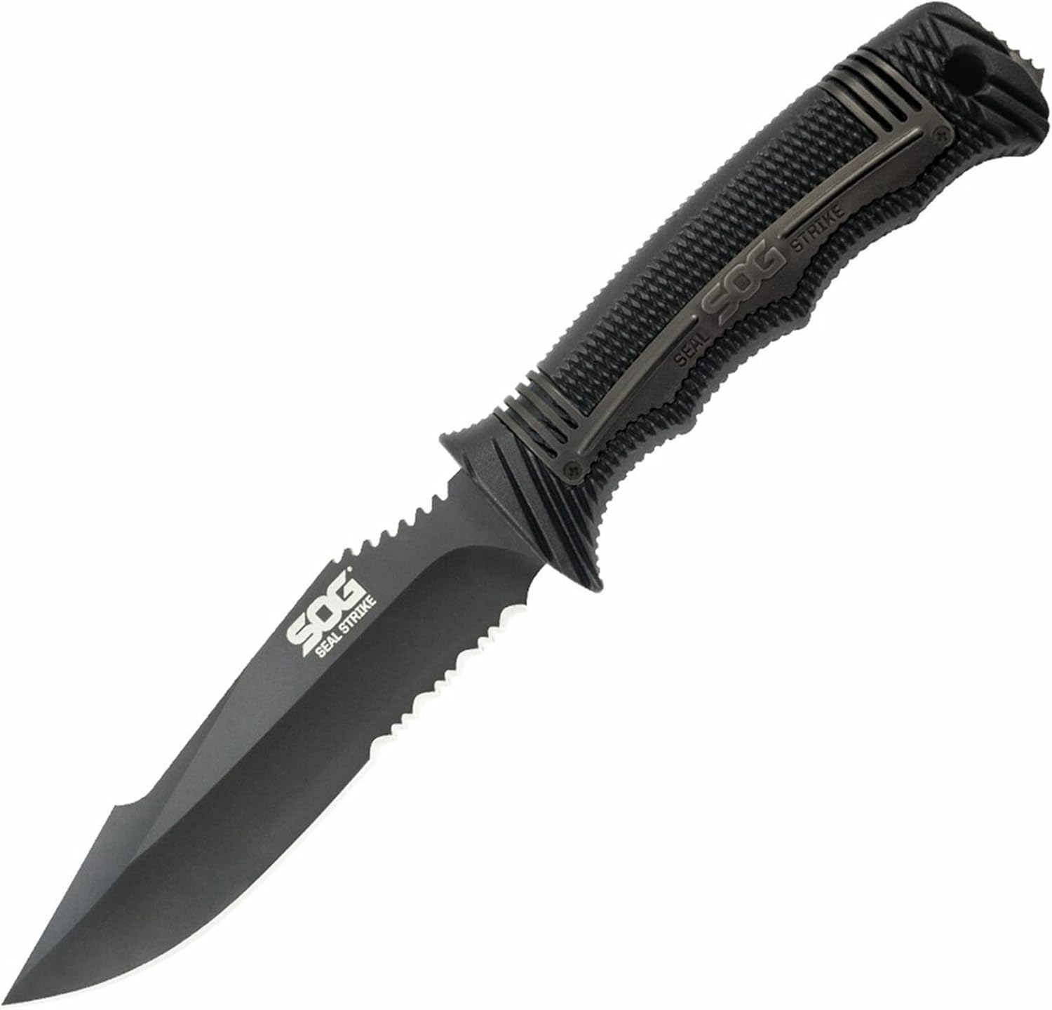 SOG Seal Strike Fixed Blade Knife with Sheath- Tactical and Hunting Knife with 4.9 Inch Partially Serrated Bowie Knife Blade and Survival Knife Line Cutter (SS1003-CP)