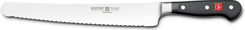 The smartly designed reverse serration edge glides through delicate textures without crushing and a deeper heel offers more comfortable use on the cutting board. The 10" Super Slicer is part of the Wusthof Classic line of cutlery; it boasts the same great features and durability of traditional Wusthof knives, including single-piece construction, precision forging, and Wusthof's PEtec edge technology.