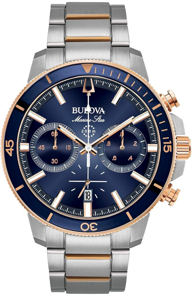 Bulova Marine Star Series C Two-Tone Rose Gold Stainless Steel 6-Hand Chronograph Quartz Watch, Blue Dial