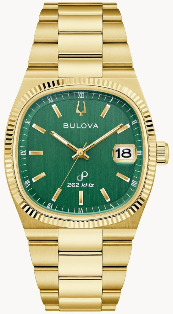 Drawing inspiration from the incredible Bulova Super Seville Day-Date of the 1970s, the men's Bulova Super Seville merges retro aesthetics with state-of-the-art movement technology for timeless modern appeal. With versatility for every style, the gold-tone stainless steel ... 38mm case strikes a bold stance with a seamless silhouette, transitioning from the TV-shaped case to the matching integrated 3-link stainless steel bracelet, which features a push-button deployant clasp. An elegant, grooved coin-edge bezel enhances the case and surrounds a flat sapphire crystal and its date magnifier. The compelling dial is a verdant vertical brushed green, with polished gold-tone hands and indices, and a date situated perfectly at 3 o'clock. The new Bulova Super Seville is powered by our proprietary high-precision quartz Precisionist movement, a revolutionary 8-jewel quartz mechanism vibrating at a remarkable 262kHz, accurate to seconds per year, with increased resistance to temperature changes, and a smooth-sweeping second hand. Embrace effortless elegance with the Bulova Super Seville.