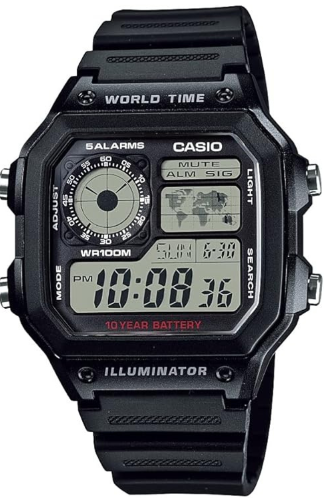 AE1200WH Series | Men’s Digital Watch | 100M WR | Multi Alarms | 100 SEC Stopwatch | Countdown Timer | World Map for World Time | LED Light | LC Analog Display | 10 Year Battery