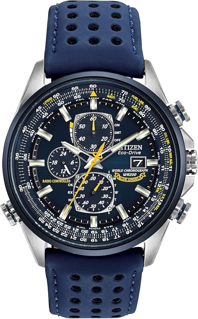 If you want a pilot-inspired timepiece that blends aviation heritage, premium styling, and modern solar technology, Citizen Blue Angels watches are among the best options on the market. Drawing from the Citizen design house, the Blue Angels collection embodies the brand's aviation-inspired design philosophy, reflecting Citizen's commitment to precision and innovation. Inspired by the U.S. Navy’s elite flight demonstration squadron, these watches have been developed in official partnership and licensed with the Blue Angels for over 25 years, making them authentic collector's items for aviation enthusiasts. The collection is also known for its distinct navy blue and yellow color scheme, a signature design element that sets it apart. These watches combine bold blue-and-yellow styling with advanced chronograph functionality, oversized pilot-friendly faces, and Citizen’s proprietary Eco-Drive solar technology—meaning they are powered by light and never need a battery replacement.