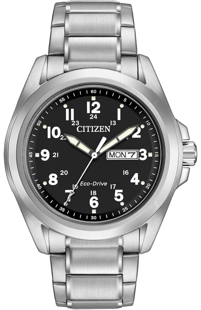 Citizen Eco-Drive Weekender Garrison Field Watch in Stainless Steel, Black Dial, Arabic Markers, Luminous, 43mm