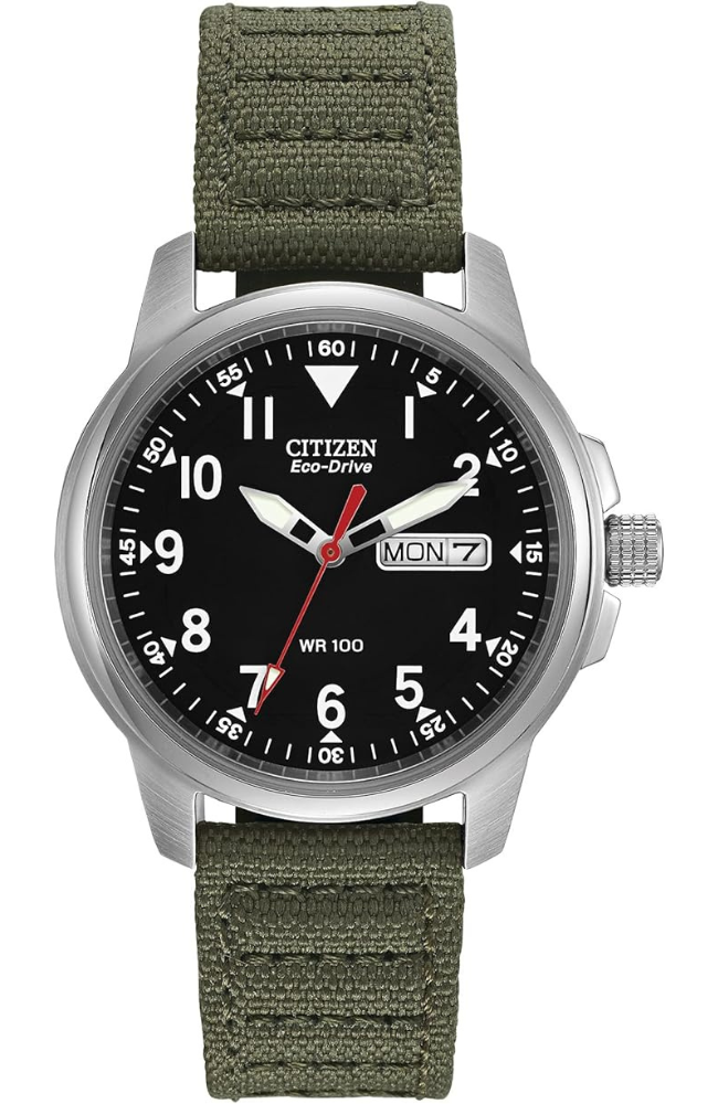 Citizen Eco-Drive Weekender Garrison Field Watch in Stainless Steel with Olive Nylon Strap, Black Dial