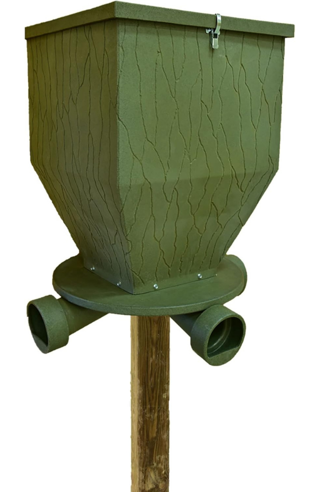 - DURABLE 200LB. UV-RESISTANT POLYMER HOPPER: Engineered for reliability, the 30-gallon tapered hopper holds up to 200 lbs of feed. Constructed from rugged, UV-resistant polymer for long-term use in sun, rain, and wildlife-heavy environments. Easy ground-level access for fast filling.
