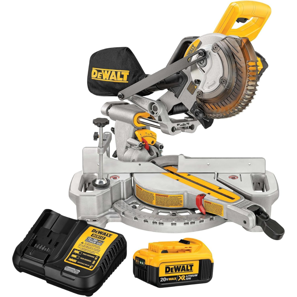 The DCS361M1 20V MAX* 7 1/4-inch Sliding Miter Saw includes a battery and charger, allowing for approximately 183 cuts of 2x4 Pine or 275 cuts of 3-1/4 Pine Baseboard. It features an adjustable stainless steel miter detent plate with 11 positive stops, enhancing productivity and ensuring precise cuts.