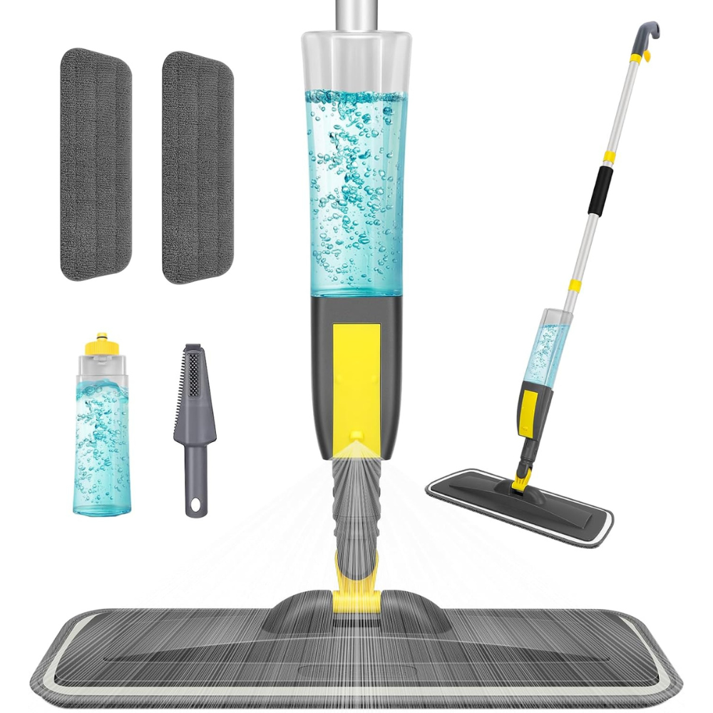 - Spray mop with washable pads, and 2 spray mop replacement pads, the high density makes the fiber pads new even after washing many times and still has strong absorption and decontamination capabilities, which saves money and practical effect.