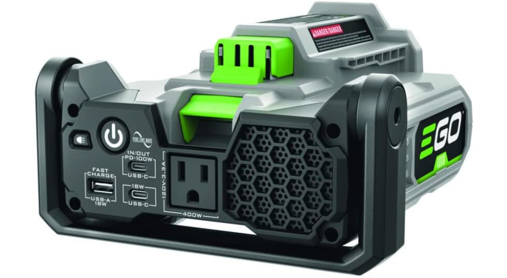 The EGO POWER+ Nexus Escape 400W Inverter with Pure Sine Wave delivers high quality, clean power to sensitive electronics. The power inverter provides 400 watts of continuous power and 800-watt peak power for devices requiring additional ramp-up power. It can power up to three USB-compatible devices simultaneously via one USB-C port, one USB-C PD port, and one USB-A port. It delivers up to 100 watts of power with the USB-C PD port for the ability to power larger devices like laptops or charge your EGO 56V ARC Lithium batteries. The Nexus Escape 400W Inverter also features a 120V power outlet to power household items via standard 120V cords while built-in LED lights provide ambient lighting during a power outage. With the EGO POWER+ Nexus Escape 400W Inverter, you’ll have portable power when you want it, power when you need it.