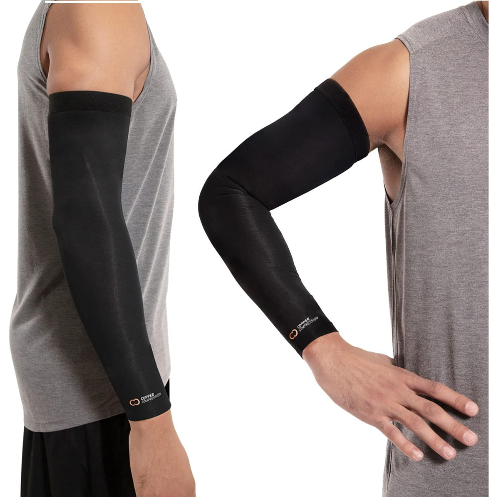 PERFORMANCE + PAIN RELIEF: The Copper Compression Arm Sleeve provides exceptional support for your arms, elbows, and forearms, ensuring all-day comfort. It is commonly used by individuals dealing with golfer's elbow, tennis elbow, arthritis, tendonitis, bursitis, osteoporosis, rehabilitation, post-surgery recovery, physical therapy, and more!