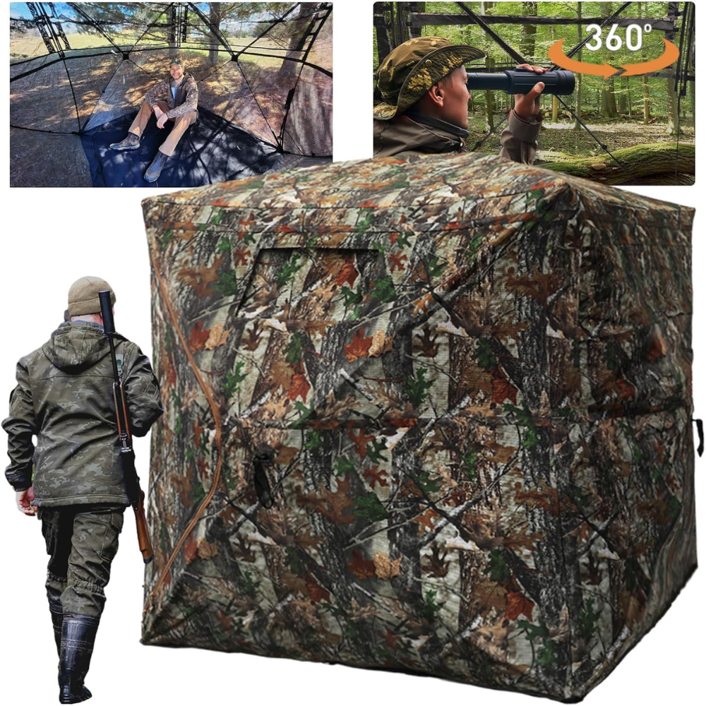 - 【SILENT & CAMOUFLAGED】HUNTSEN's hunting ground blinds feature 3 silent-sliding- sliding windows on each side, ensuring hunters remain undetected. The realistic camo pattern and brushed-in loops seamlessly blend the deer blind with the surrounding habitat for enhanced concealment to perfect camouflage.