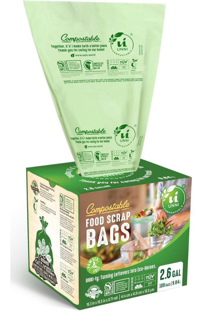 UNNI Compostable Liner Bags, 2.6 Gallon, 9.84 Liter, Extra Thick 0.71 Mil, 100 Count, Small Kitchen Food Scrap Waste Bags, ASTM D6400, US BPI, CMA and Europe OK compost HOME Certified, San Francisco