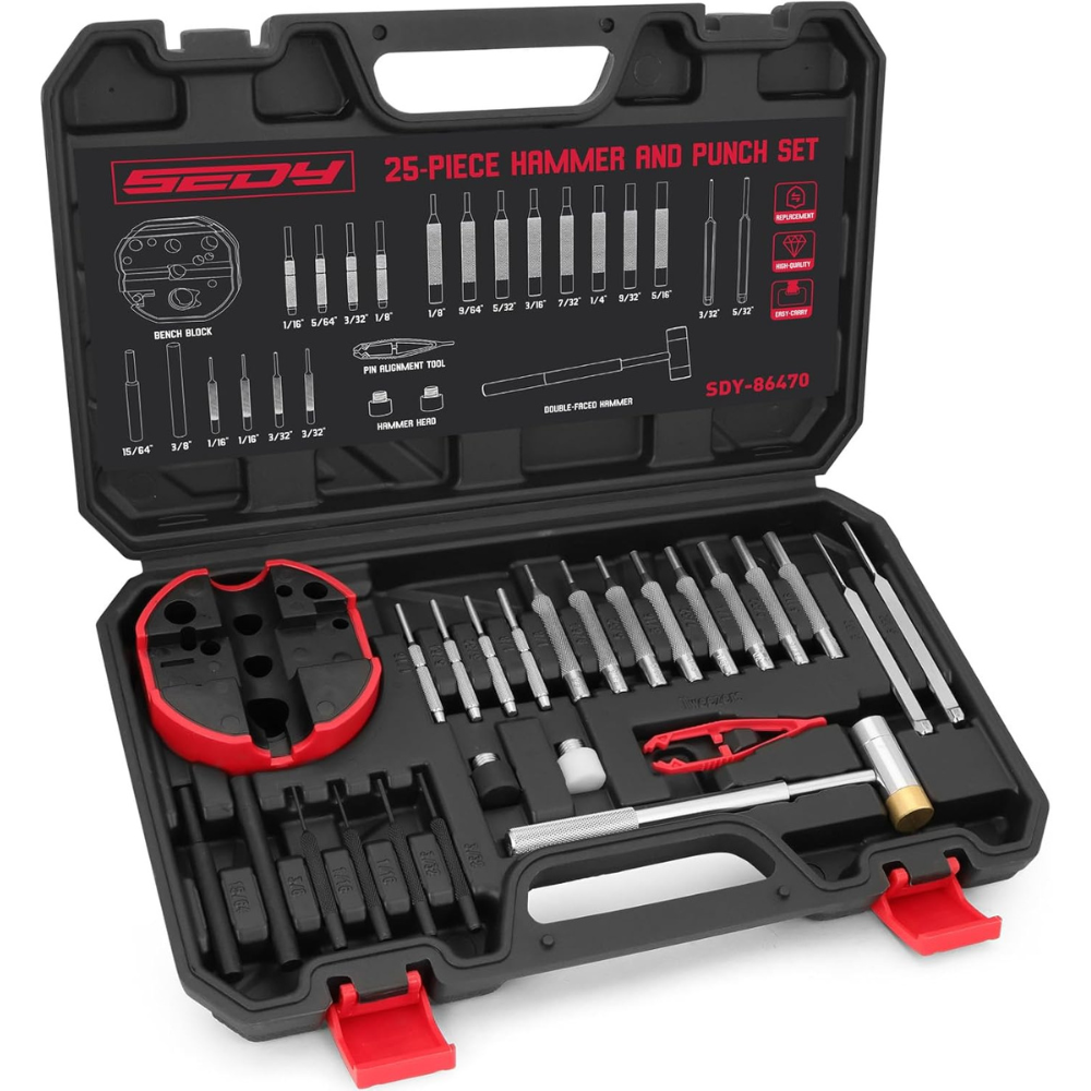 SEDY Premium Pin Punch Hammer Set: 25-Piece Punch Set and Hammer with Bench Block, Steel Roll Pin Punch Set, Pin Punches with Replaceable Face Hammer, Mechanical Repair Tool for Maintenance