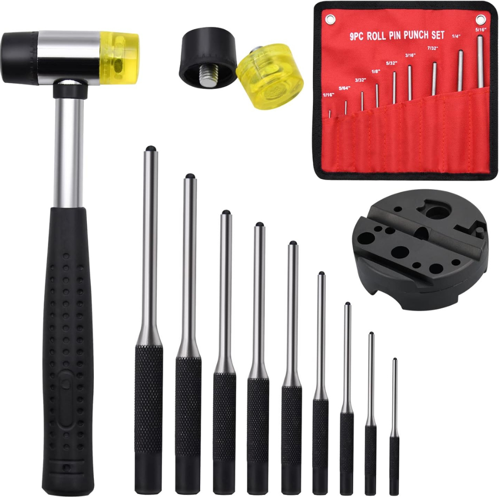 - 【Package Include】- This pin punch set includes a universal block, 9pcs of different-sized pin punches, and a hammer with 2 spare rubber heads. This perfect kit will definitely accompany you for a long time in countless jobs, saving time and energy.