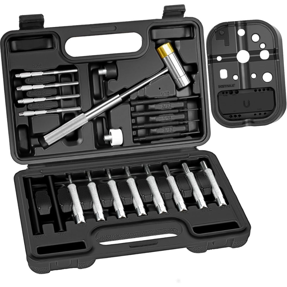 All-IN-1 Set: Includes everything you need to get started and is suitable for everyone, whether you're a novice or a veteran. This punch set includes 1/8", 9/64", 5/32", 3/16", 7/32", 1/4", 9/32", and 5/16". 2Pcs 3/8",15/64" plastic pin punches; 1 metal tweezers and 1 hammer with 4 detachable hammer heads; 4Pcs hollow end starter punch set including 1/16”,5/64”,3/32”,1/8”; 2 Pcs flat pin punches including 1/16" and 3/32"; 2 Pcs roll pin punches including 1/16" and 3/32"; 8Pcs carbon steel punches.