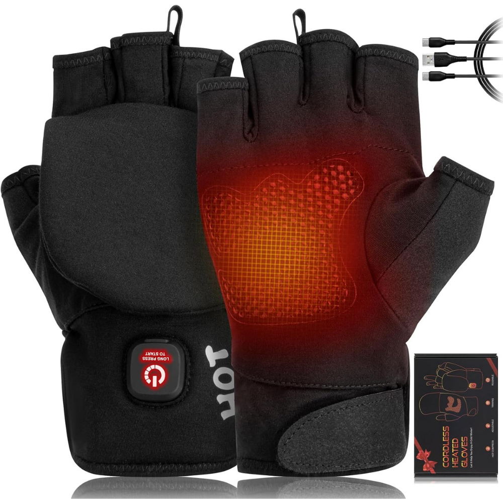 - Rechargeable Heated Gloves: These versatile gloves are designed for maximum comfort. With a 2-in-1 full-finger and half-finger design and a built-in rechargeable battery, you won't need to fuss with cords, ensuring both safety and convenience. The gloves feature a high-quality fiber heating element that covers both sides of your hands, providing rapid warmth within 5 seconds of activation, making winter chill a thing of the past.