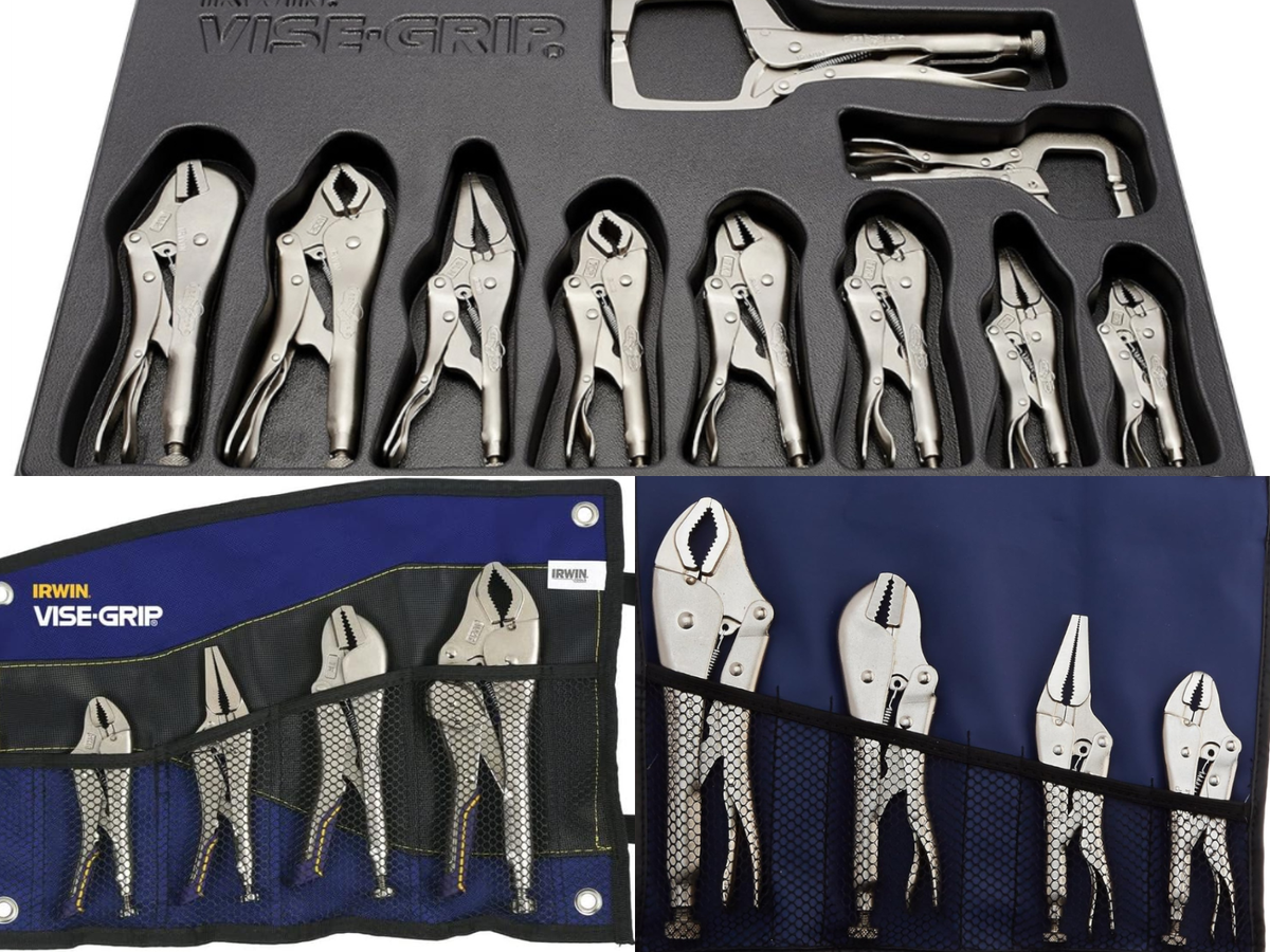 - Set includes 6" and 11" Original Locking Clamps, 10" and 7" straight jaws, 10" and 7" curved jaws, 7" and 5" curved jaws with a wire cutter, 6" and 9" long noses with a wire cutter, Original Locking Pliers, and a tray