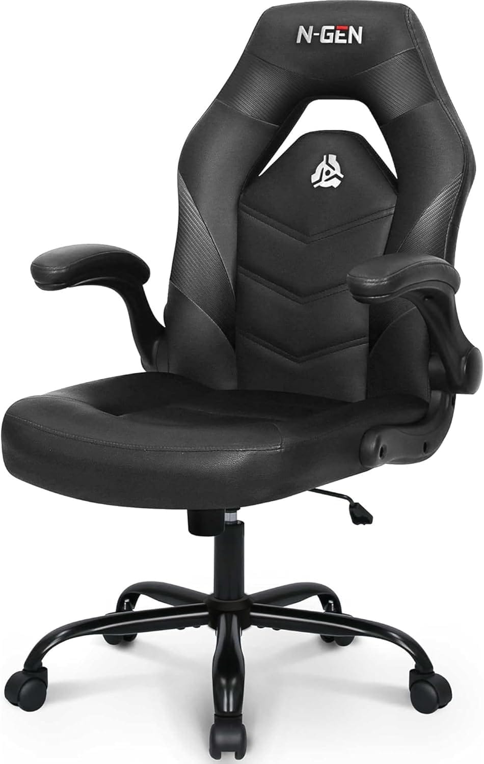 N-GEN GAMING Video Gaming Chair Ergonomic Office Desk Chair with Lumbar Support Adjustable Height Padded Flip Up Arms and Swivel Wheels Racing Style Design for Adults with PU Leather (Black)