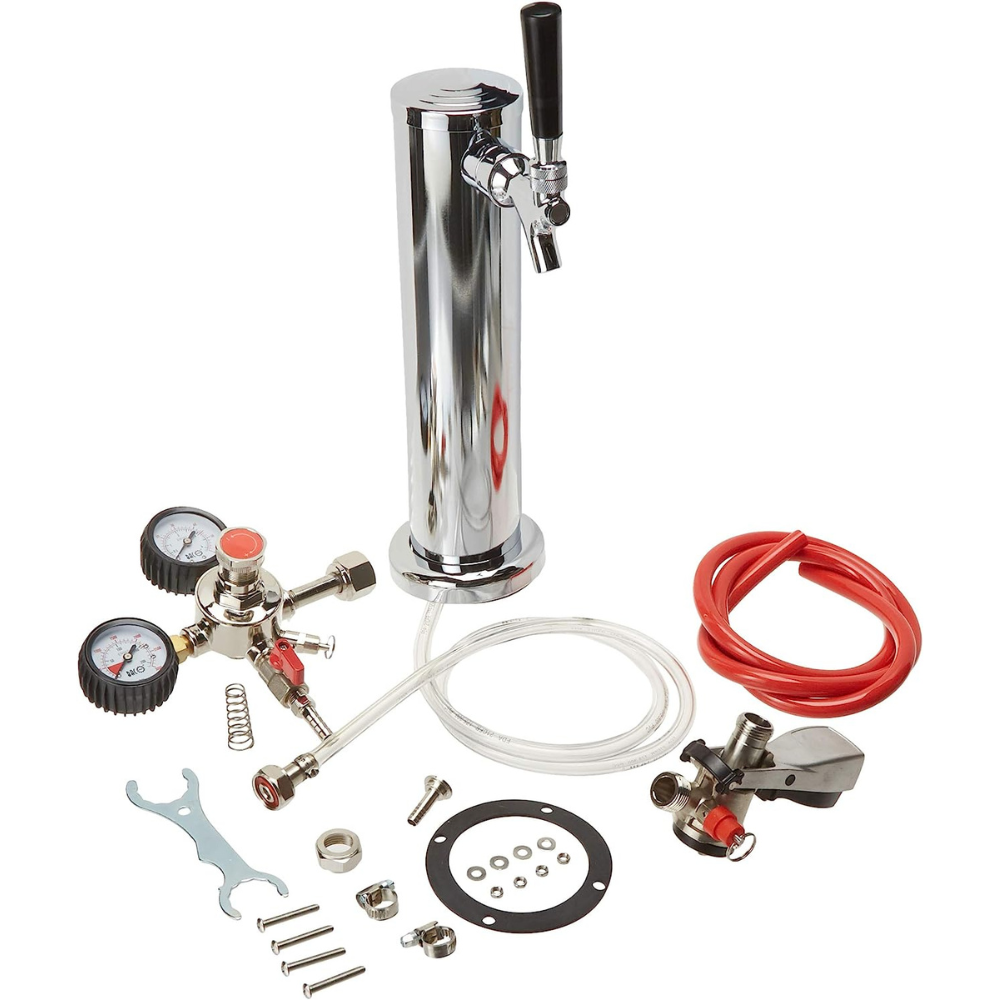- STYLISH SINGLE FAUCET DRAFT BEER TOWER: Elevate your kegerator with the sleek design of the 3" diameter air-cooled Kegco D4743T draft beer tower. With its eye-catching Standard-plated metal finish and matching faucet with a metal lever, this tower is similar to those found on most commercial-grade kegerators. It comes complete with 5 feet of clear beer tubing, a nozzle, and a hex nut assembly for quick connection to all standard keg couplers. For easy installation, a gasket and screws are also included.