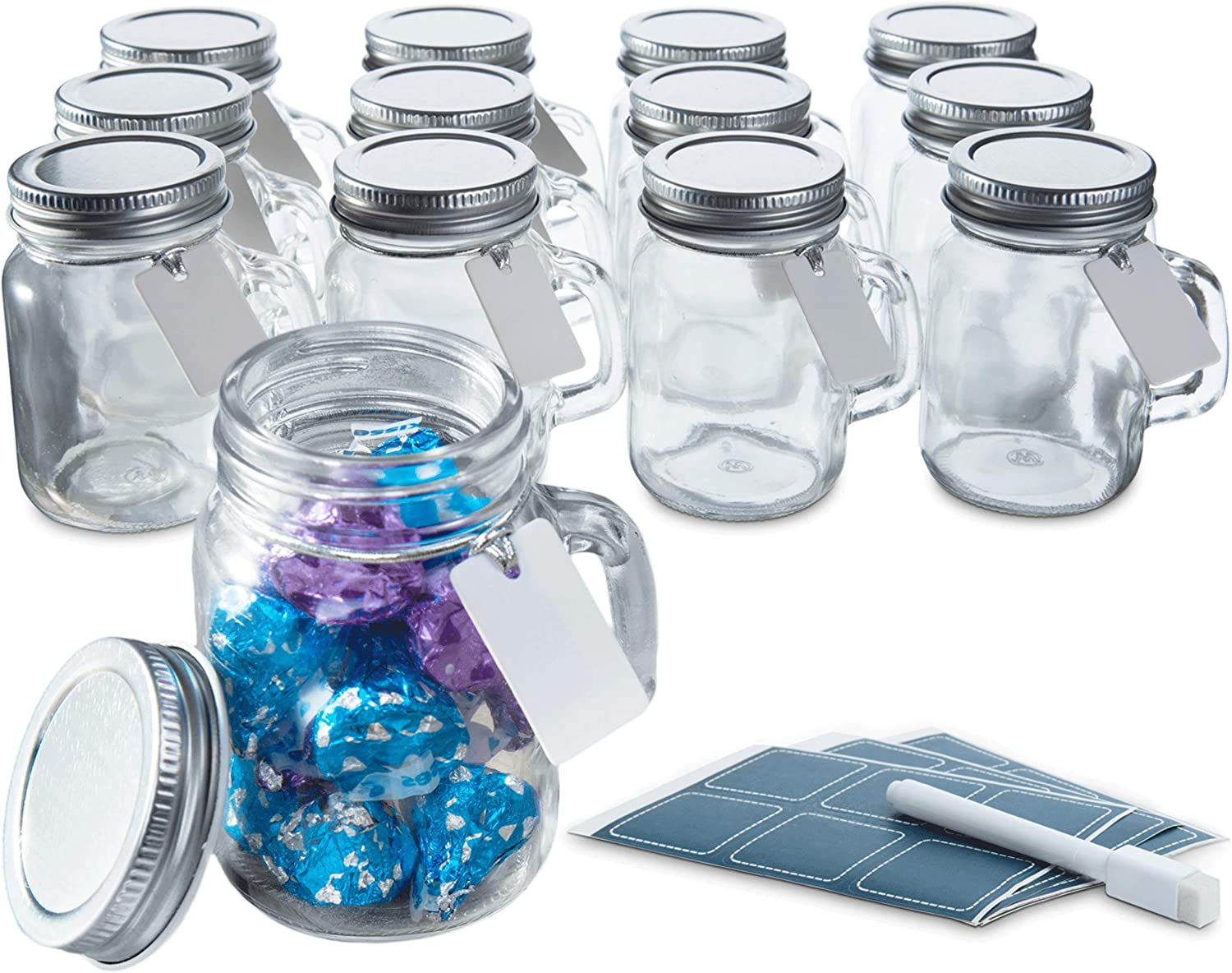 The Otis Classic Mason Jar Chalkboard favors are perfect for weddings, birthday parties, reunions, and other events where guests will be celebrating together. These mini mason jars are well crafted to hold 3.4 ounces of goodies and they come with their own metal lid as well as glass jar chalkboard stickers for easy customization.